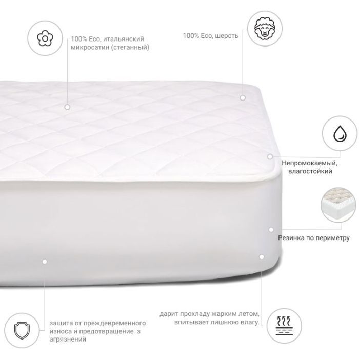 Розмір - 140 x 200 см, кріплення - з гумкою уздовж периметру, наповнювач - овеча натуральна вовна: 70%, поліефірний розпушувач: 30%, мікросатин, Колір - білий