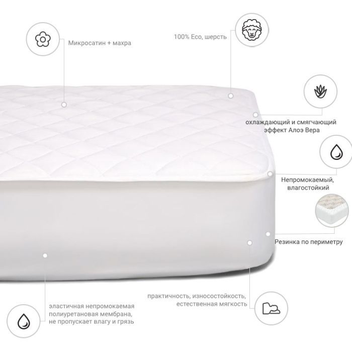 Розмір - 70 x 140 см, кріплення - з гумкою уздовж периметру, наповнювач - овеча натуральна вовна: 70%, поліефірний розпушувач: 30%, мікросатин + махра, Колір - білий