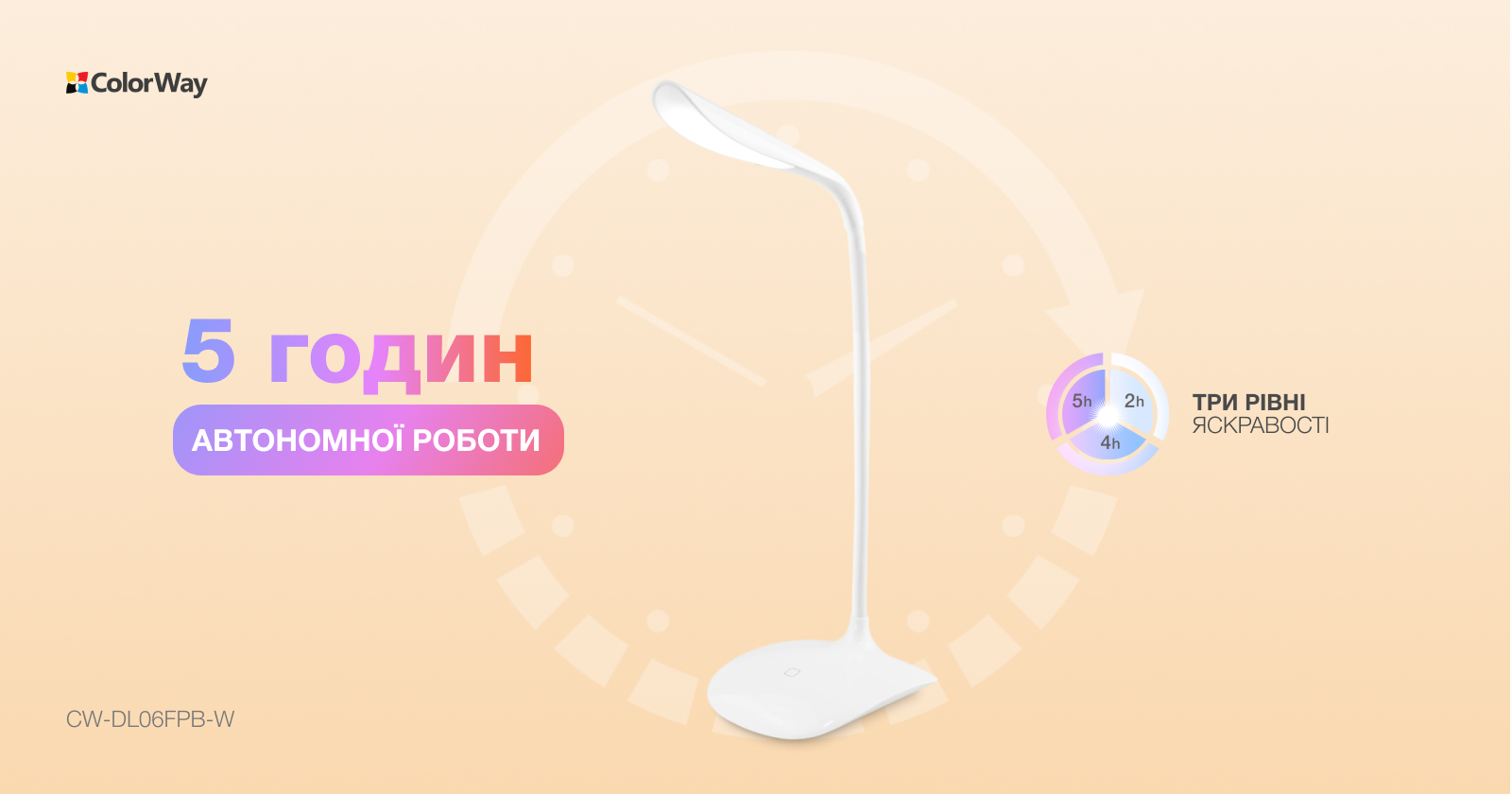 Вбудований акумулятор забезпечує від 2 до 5 годин автономної роботи - чого достатньо більшості повсякденних завдань. Для підключення та заряджання не потрібні спеціальні адаптери: достатньо підключити лампу до будь-якого пристрою з USB-роз'ємом, комп'ютера, ноутбука, зарядного пристрою для смартфона або PowerBank.
