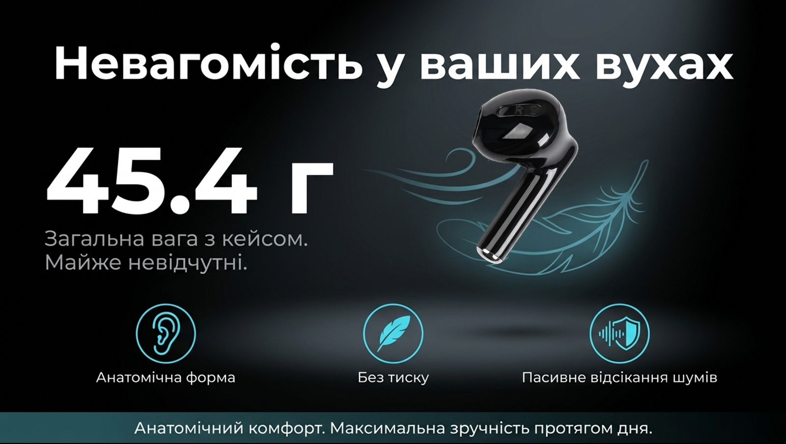 Ергономіка моделі розроблена так, щоб навушники залишалися непомітними навіть після багатогодинного використання. Форма вкладишів повторює анатомічні контури вуха, забезпечуючи надійну фіксацію та відсутність дискомфорту. Загальна вага пристрою разом із футляром становить лише 45.4 грама, тому вони легко вміщуються у будь-яку кишеню, не створюючи зайвого об’єму. Це ідеальний вибір для активних людей, які проводять день у постійних дзвінках та переїздах. Ви отримуєте невагомість, що дозволяє зосередитися на справах чи відпочинку, зовсім забувши про фізичну присутність гаджета у ваших вухах.