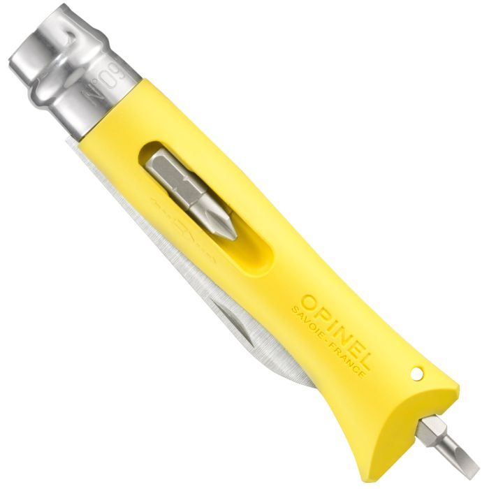 Повсякденний ніж Opinel №9 Diy має в комплекті дві біти-викрутки (плоска і хрестоподібна), які встановлюються в підмагнічений бітотримач в торці поліпропіленової рукоятки, а в транспортувальному режимі зберігаються в її бічних поглибленнях. Ми маємо компактний, практичний і дуже зручний ніж-мультитул, який володіє відмінними ріжучими властивостями і багатофункціональністю.