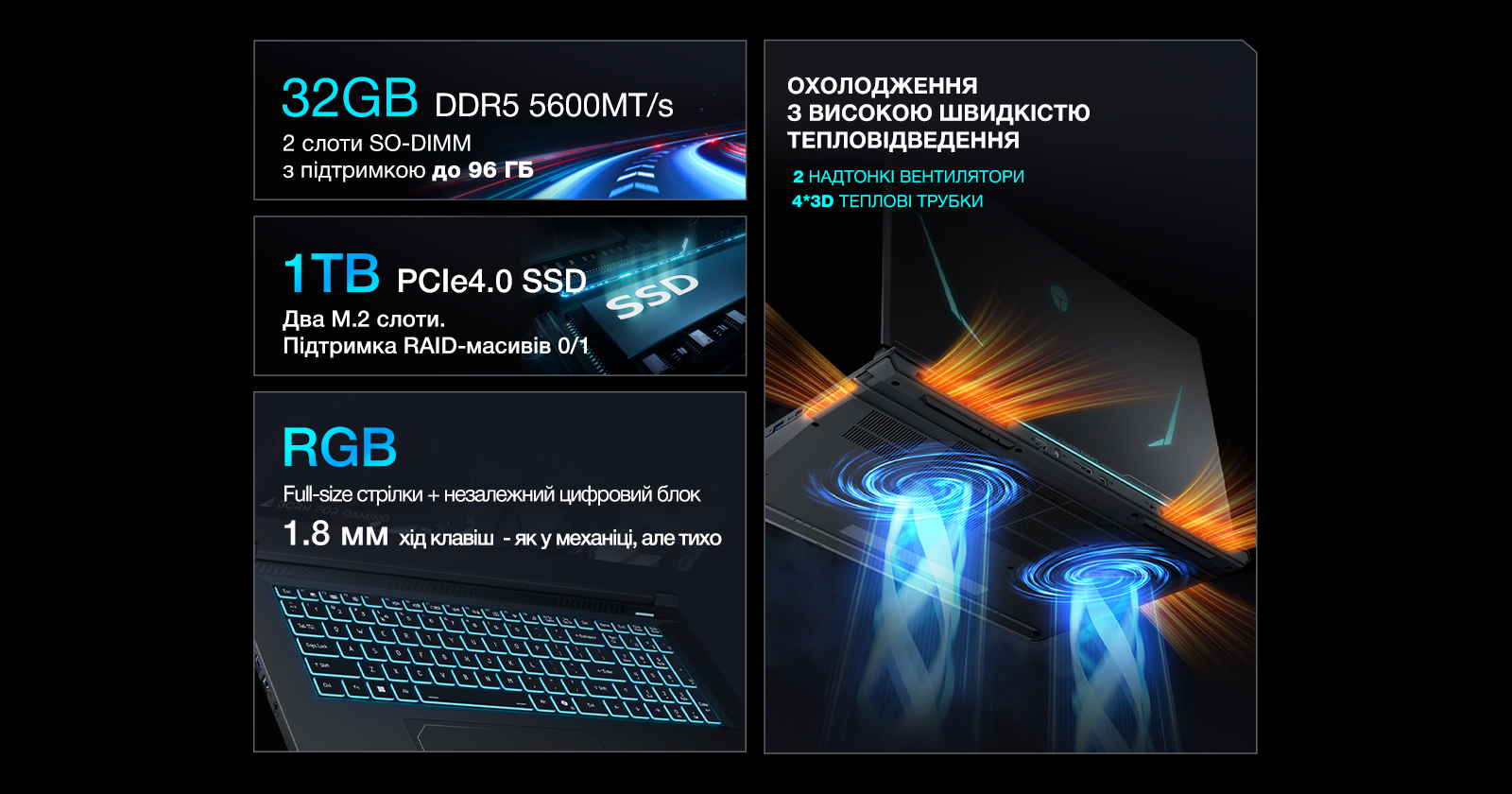 Ноутбук обладнаний 32 ГБ оперативної памʼяті DDR5 із частотою 5600 МТ/с, з можливістю розширення до 96 ГБ завдяки двом слотам SO-DIMM. За охолодження відповідає система з двома надтонкими вентиляторами та чотирма 3D-тепловими трубками, що гарантує стабільну роботу під навантаженням. Для зберігання даних передбачено SSD на 1 ТБ стандарту PCIe 4.0, а також два слоти M.2 з підтримкою RAID 0/1. Клавіатура має RGB-підсвітку, повнорозмірні клавіші-стрілки та незалежний цифровий блок, що особливо зручно для роботи з числами та ігор. Хід клавіш 1.8 мм забезпечує приємні тактильні відчуття, схожі на механіку, але з тихою роботою.