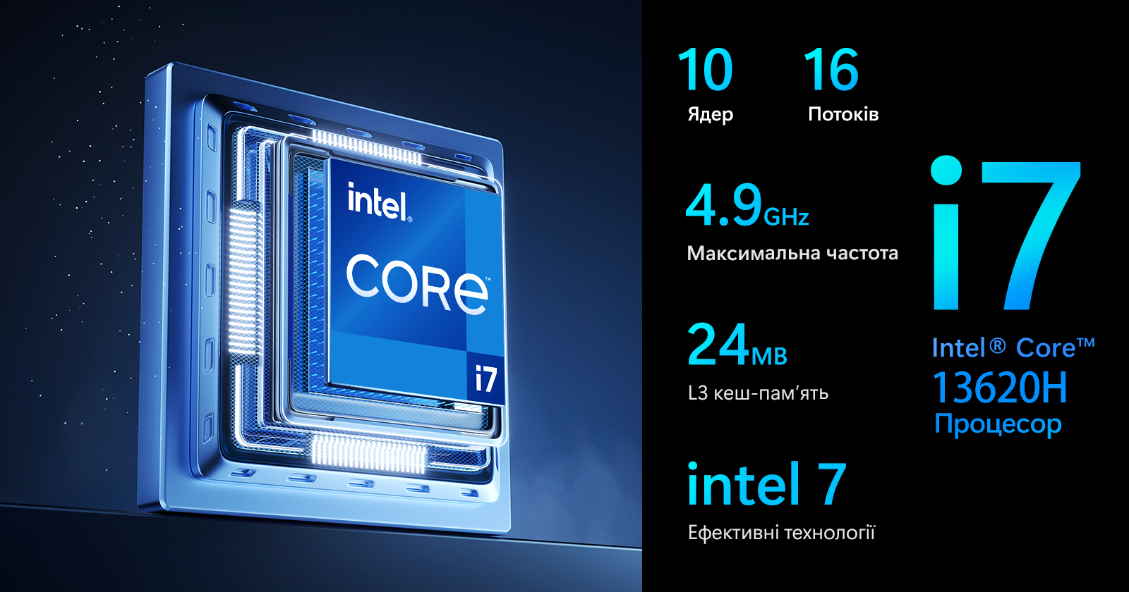 Intel Core i7-13620H має 10 ядер (6 продуктивних + 4 енергоефективних) та 16 потоків, забезпечуючи стабільну роботу як в іграх, так і в професійних додатках. Максимальна частота — до 4.9 ГГц, об’єм кеш-памʼяті L3 — 24 МБ.