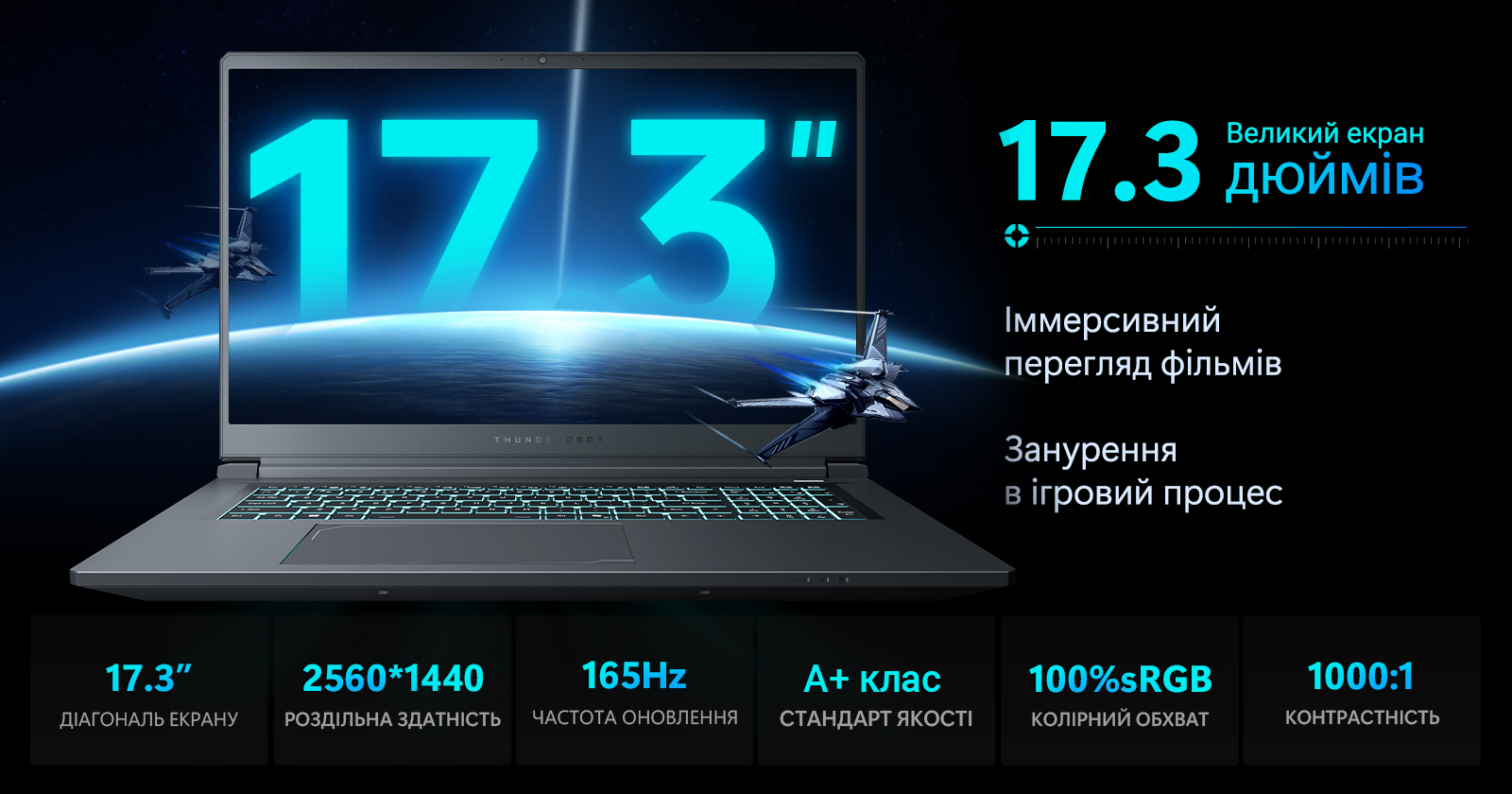 17.3-дюймовий екран із роздільною здатністю 2560×1440 (QHD) і частотою 165 Гц відкриває новий рівень візуального досвіду. Панель класу A+, 100% покриття sRGB, контрастніст