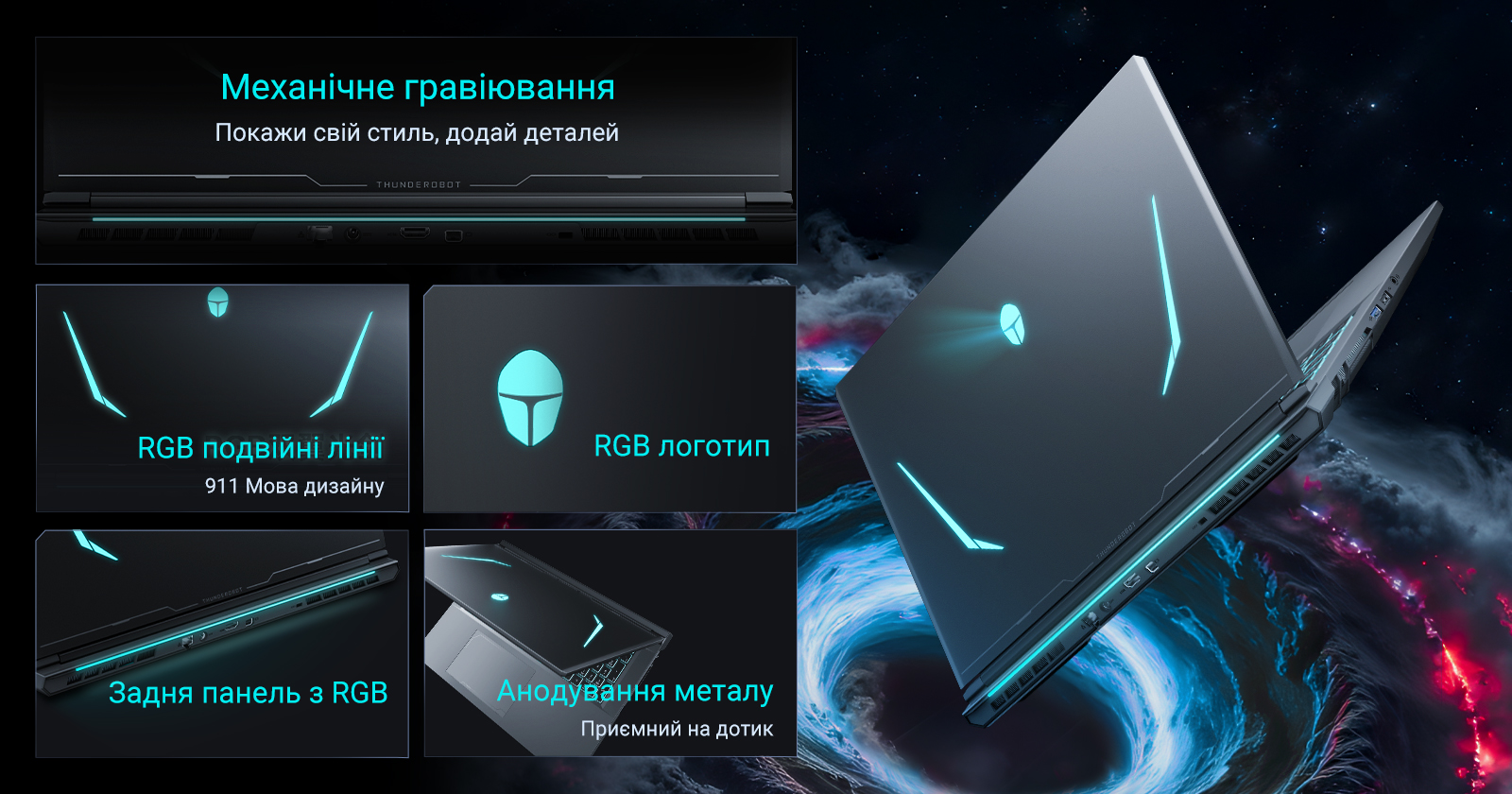 Ноутбук прикрашено механічним гравіюванням, подвійними RGB-лініями, підсвіченим логотипом RGB та RGB-панеллю ззаду. Корпус пройшов анодування металу, що додає йому преміальності.