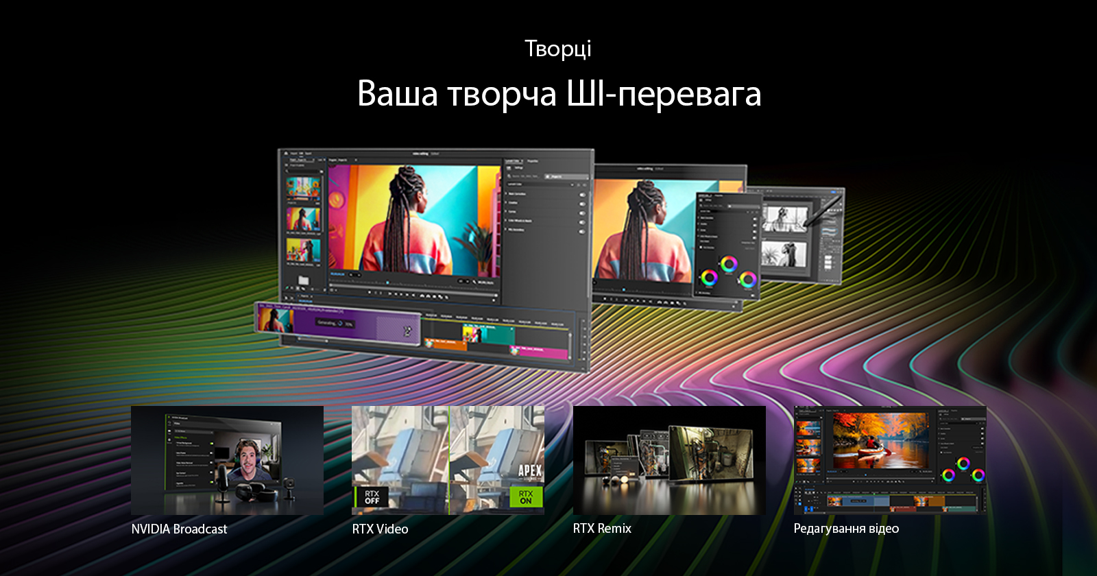 NVIDIA Studio — ваша творча перевага. Графічні процесори серії GeForce RTX 50 надають трансформаційну продуктивність у редагуванні відео, 3D-рендерингу та графічному дизайні. Відчуйте прискорення RTX у найкращих творчих програмах, застосовуйте драйвери NVIDIA Studio найвищого рівня, що постійно розроблюються та оновлюються для забезпечення максимальної стабільності, а також скористайтеся набором ексклюзивних інструм