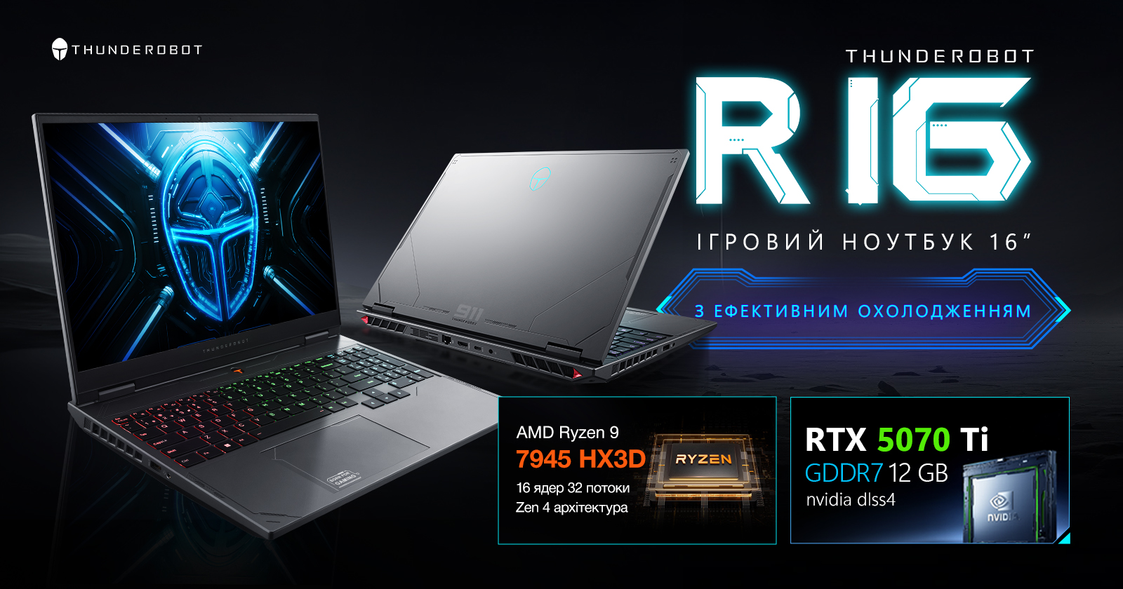 Thunderobot R16 — це ноутбук, створений для користувачів, яким потрібна потужність без втрати мобільності. Він ідеально підходить як для сучасних ігор, так і для роботи з 3D-графікою, відеомонтажем або цифровим дизайном. У його серці — процесор AMD Ryzen 9 7945HX3D (2.3 - 5.4 ГГц). Графіку забезпечує NVIDIA GeForce RTX 5070 Ti 12Gb, яка підтримує трасування променів для максимального реалізму у візуальних сценах.