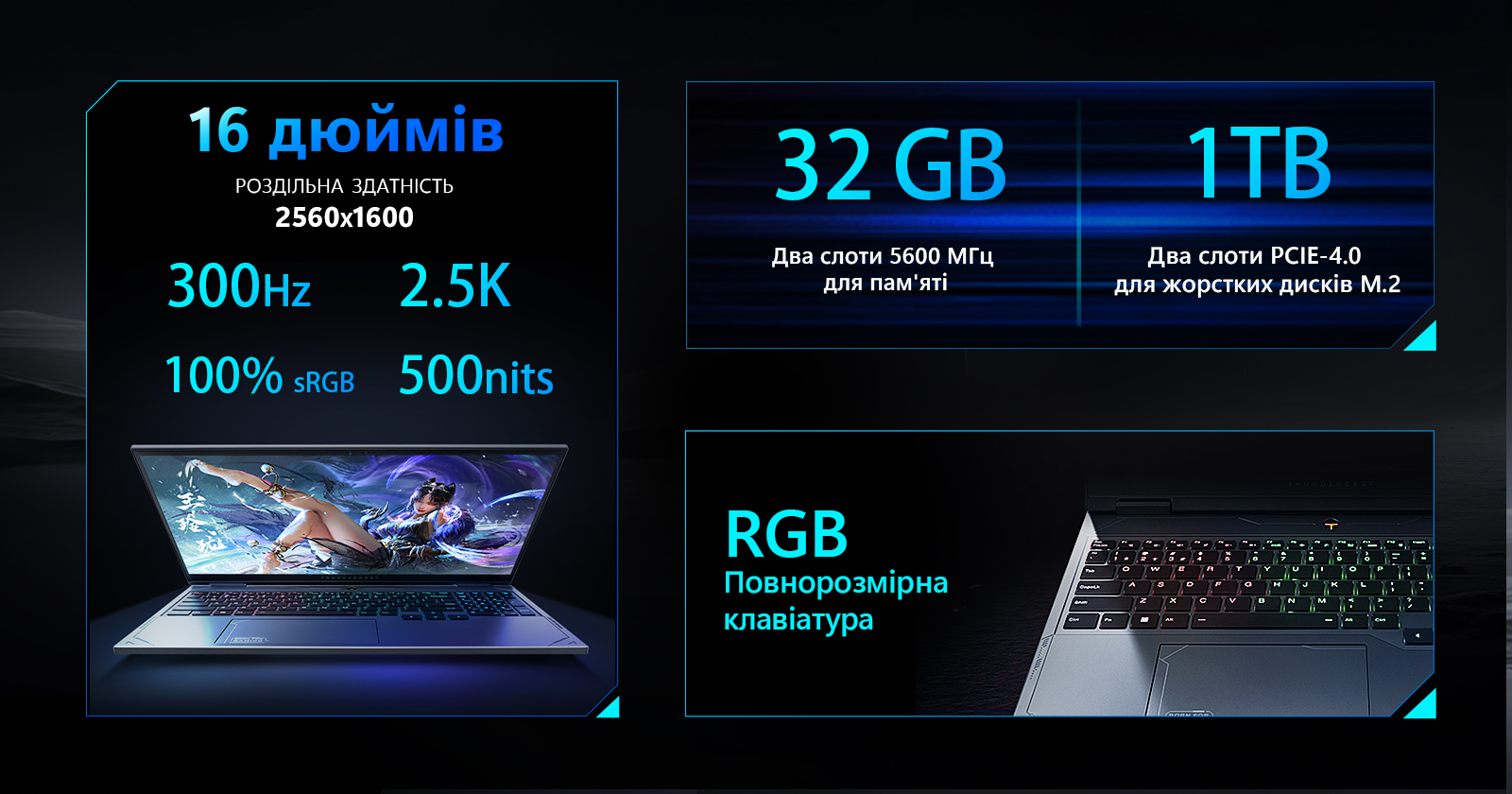 Завдяки 16-дюймовому WQXGA-екрану (2560×1600) з частотою 300 Гц, ноутбук забезпечує плавне зображення з глибокими кольорами та високою деталізацією. Яскравість 500 ніт дозволяє комфортно працювати навіть при денному освітленні. Клавіатура має RGB-підсвітку, повнорозмірні стрілки та незалежний цифровий блок, що підходить і для геймерів, і для офісної роботи. Оперативна пам’ять — 32 ГБ DDR5 5600 МТ/с, розширювана до 96 ГБ, зберігання — 1 ТБ SSD PCIe 4.0 із двома слотами M.2 для RAID.