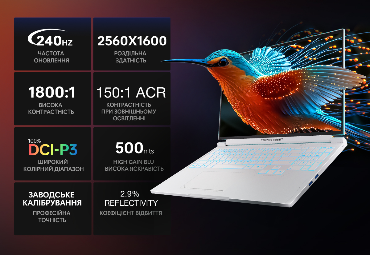 Дисплей ноутбука гарантує бездоганну деталізацію завдяки роздільній здатності 2560x1600 пікселів та частоті оновлення 240 Гц. Реалістичне відтворення кольорів забезпечується 100% охопленням діапазону DCI-P3 та високою яскравістю 500 ніт. Матриця характеризується контрастністю 1800:1 та проходить заводське калібрування для досягнення професійної точності відтінків. Комфортну роботу при різному освітленні забезпечують низький коефіцієнт відбиття та високі параметри контрастності.