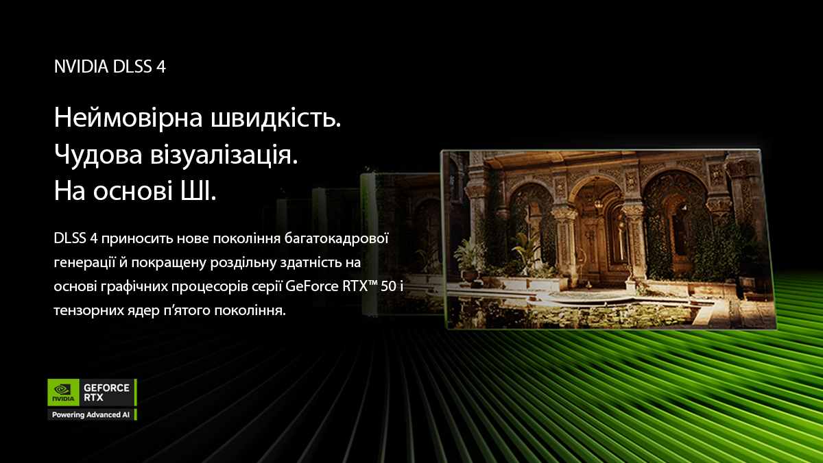 Інноваційна технологія NVIDIA DLSS 4 забезпечує неймовірну плавність ігрового процесу та чудову візуалізацію завдяки алгоритмам штучного інтелекту. Це рішення впроваджує нове покоління генерації кадрів, що значно покращує сприйняття динамічних сцен. Покращена роздільна здатність та висока ефективність обробки зображення стають можливими завдяки потужності графічних процесорів серії GeForce RTX 50 та використанню тензорних ядер п’ятого покоління.