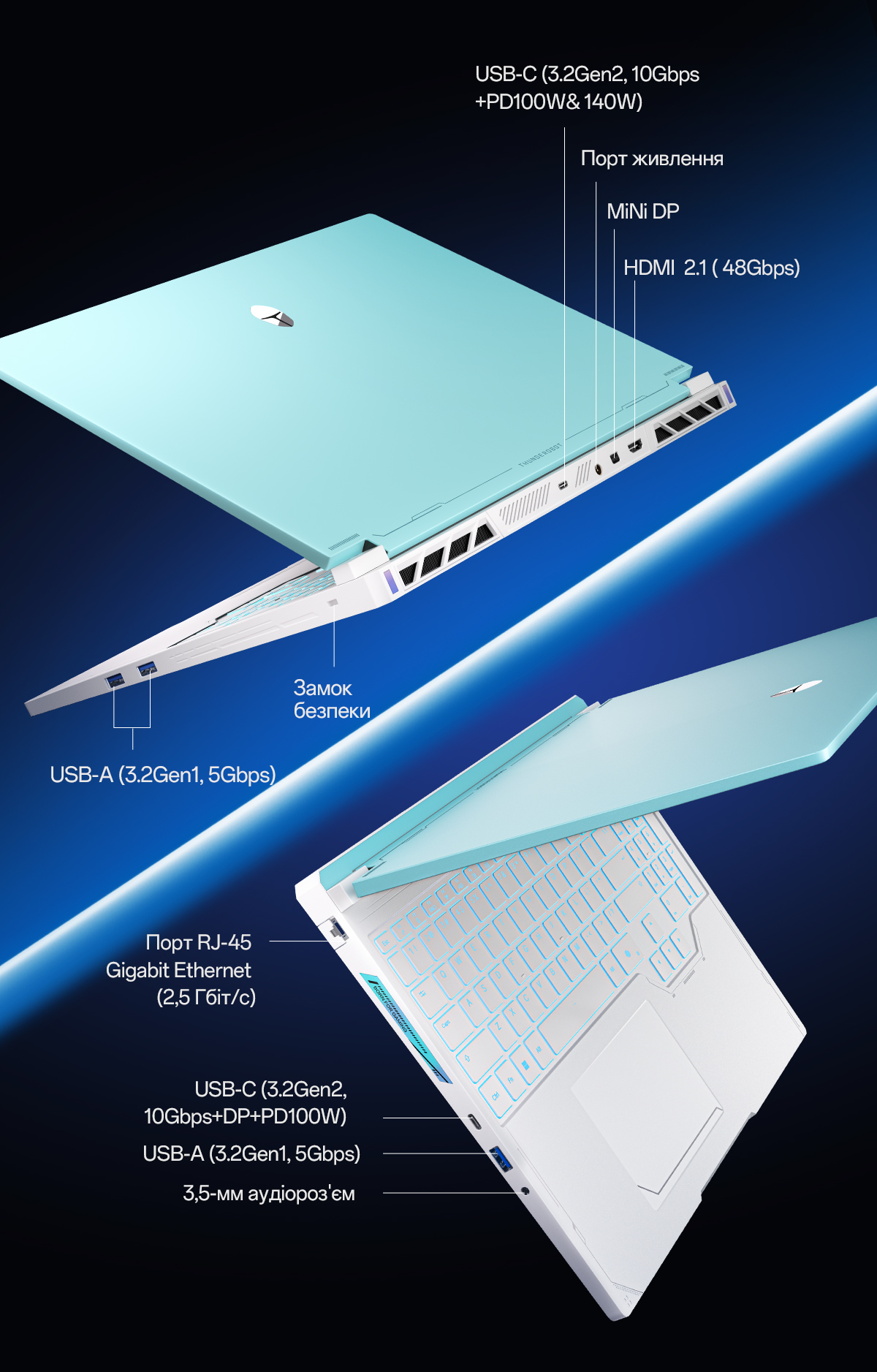 Елегантний бірюзовий корпус при вазі всього 2.5 кг робить Thunderobot RS16 не тільки потужним, але й портативним рішенням для тих, хто постійно в русі. А з ємністю акумулятора у 80 Втг ви зможете залишатися продуктивними протягом тривалого часу, не залежачи від розетки.
