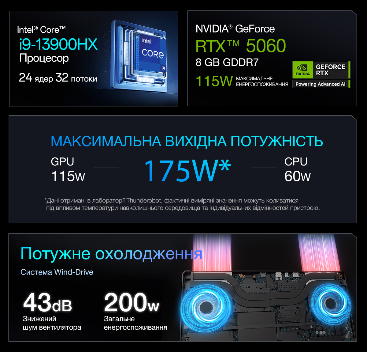 Система побудована на базі 24-ядерного процесора Intel Core i9 13900HX, архітектура якого дозволяє ефективно розподіляти навантаження між завданнями різної складності. Графічну підсистему представляє відеокарта NVIDIA GeForce RTX 5060 з 8 ГБ пам’яті, яка стане ідеальним інструментом як для геймерів, так і для творців контенту. Ефективна система охолодження Wind-Drive підтримує стабільну роботу компонентів, забезпечуючи низький рівень шуму 43 дБ та комфортні температурні показники навіть під час тривалих ігрових сесій.