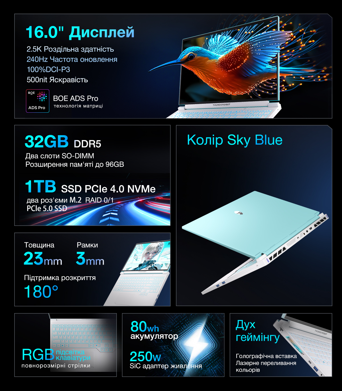 Візуальну досконалість забезпечує 16-дюймовий дисплей із роздільною здатністю 2.5K та ігровою частотою оновлення 240 Гц. Використання матриці з технологією BOE ADS Pro, яскравістю 500 ніт та 100% охопленням колірного простору DCI-P3 гарантує насичене та реалістичне зображення. Швидкодію системи підтримують 32 ГБ оперативної пам’яті DDR5 та швидкий SSD накопичувач на 1 ТБ. Усе це розміщено в стильному корпусі кольору Sky Blue товщиною 23 мм, який здатен розкриватися на 180 градусів.
