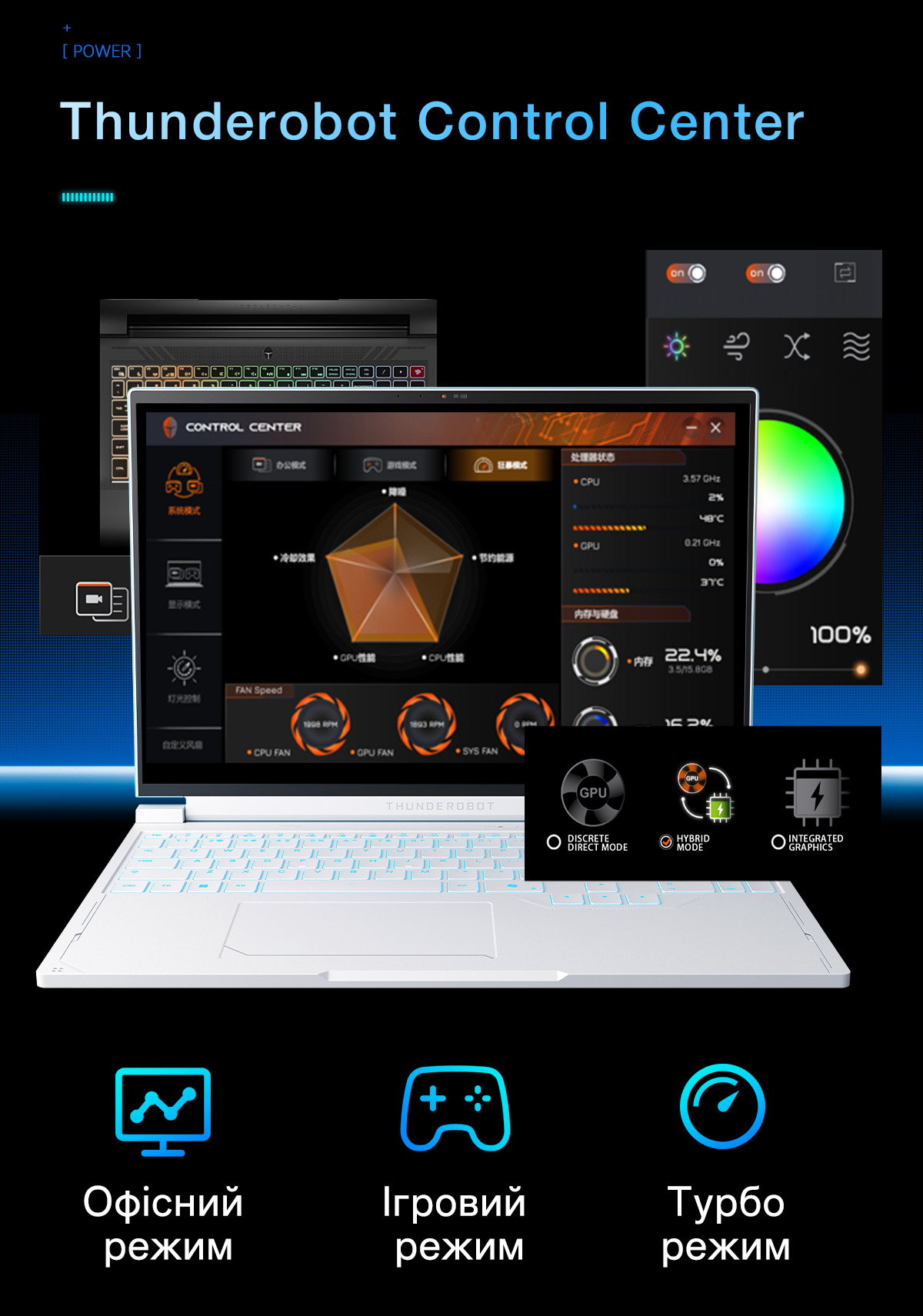 Фірмове програмне забезпечення Thunderobot Control Center надає гнучкі інструменти для керування ключовими параметрами ноутбука. Користувачам доступні три сценарії роботи: енергоефективний офісний, збалансований ігровий та максимальний турбо режим. Інтерфейс дозволяє перемикати графічні налаштування між дискретним, гібридним та інтегрованим режимами. Також передбачено функції моніторингу температур, налаштування обертів вентиляторів та керування RGB-підсвічуванням.
