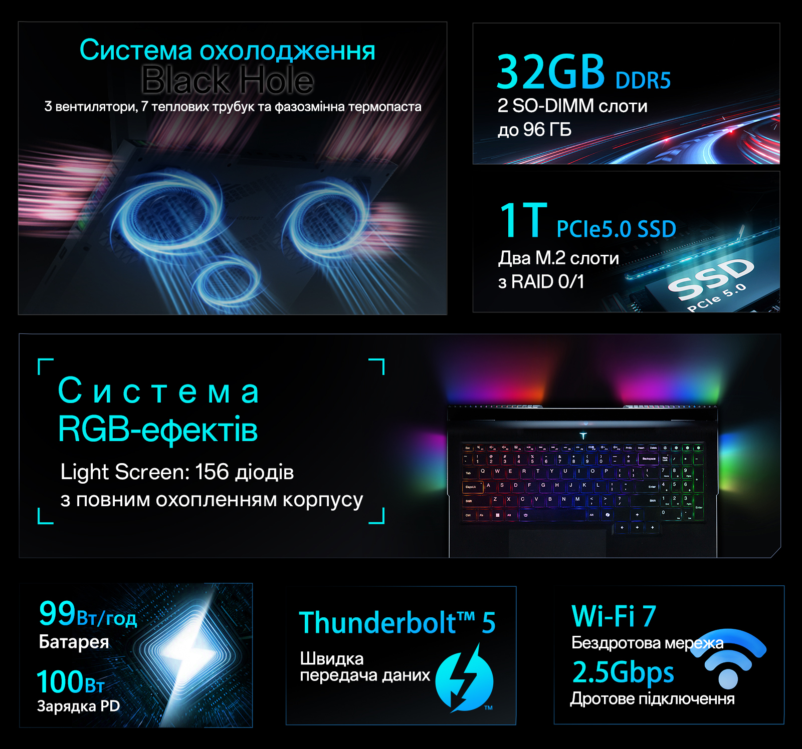 Стабільність системи під піковими навантаженнями гарантує інноваційна система охолодження Black Hole, яка використовує 3 вентилятори, 7 теплових трубок та фазозмінну термопасту для ефективного розсіювання тепла. Високу автономність забезпечує батарея ємністю 99 Вт/год із підтримкою швидкої зарядки PD 100 Вт. Комунікаційний арсенал включає порт Thunderbolt 5, модуль Wi-Fi 7 та мережеву карту 2.5Gbps, а візуальний стиль довершує система підсвічування Light Screen із 156 діодами по корпусу.