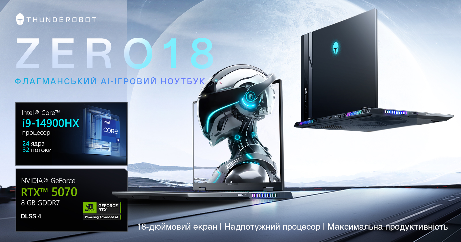 Thunderobot Zero 18 відкриває еру інтелектуального геймінгу завдяки поєднанню передових компонентів та штучного інтелекту. В основі лежить 24-ядерний процесор Intel Core i9-14900HX, здатний впоратися з найважчими обчисленнями, та новітня відеокарта NVIDIA GeForce RTX 5070 з 8 ГБ пам'яті GDDR7. Підтримка технології DLSS 4 гарантує максимальний FPS на великому 18-дюймовому екрані. Ця флагманська платформа створена для домінування в іграх та ефективної роботи зі складним контентом без жодних обмежень.