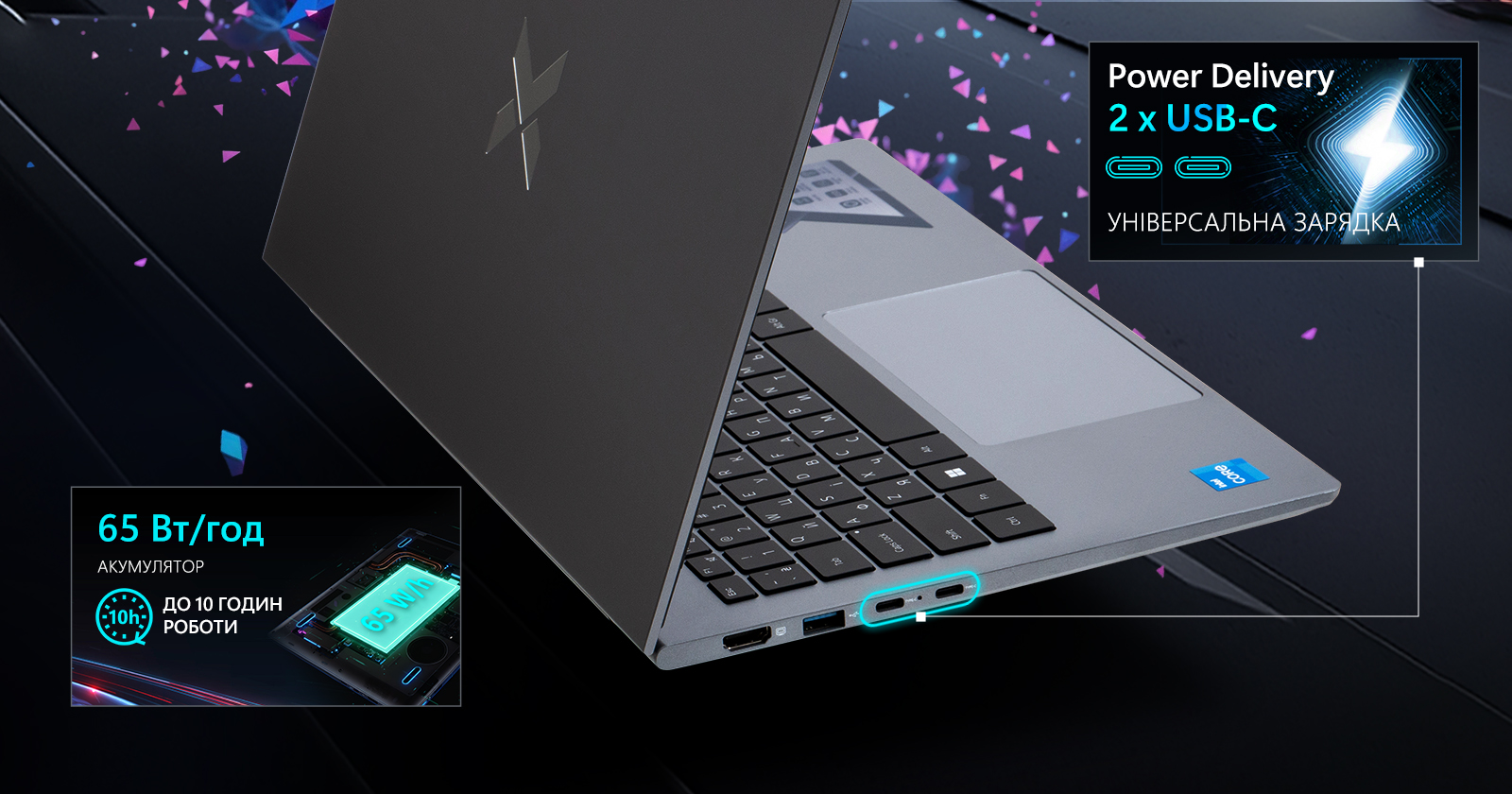 Незаперечна перевага цієї моделі — це її виняткова автономність та гнучкість у живленні. Ноутбук оснащений потужним акумулятором на 65 Вт/год, який значно збільшує час роботи. Такої ємності цілком вистачає майже до 10 годин безперервної роботи, покриваючи повний робочий день без прив'язки до розетки. Зарядний пристрій тепер має універсальний інтерфейс Type-C, що спрощує організацію робочого місця та зменшує кількість кабелів. Більше того, ноутбук обладнаний двома повноцінними портами Type-C, і КОЖЕН із них підтримує функцію зарядки (Power Delivery). Це дозволяє заряджати ноутбук як від фірмового адаптера, так і від зовнішніх акумуляторів, забезпечуючи максимальну зручність і незалежність у подорожах.