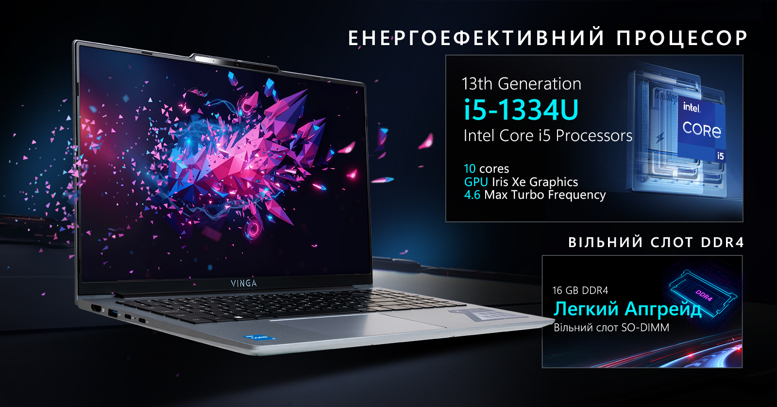 Основною перевагою Vinga Iron S151 є його продуктивність. Завдяки процесору Intel Core i5-1334U 13-го покоління з 6 ядрами та частотою до 4.6 ГГц, він з легкістю справляється з багатозадачністю. Цей процесор забезпечує швидку обробку даних та енергоефективність, що особливо важливо для тривалого автономного використання.