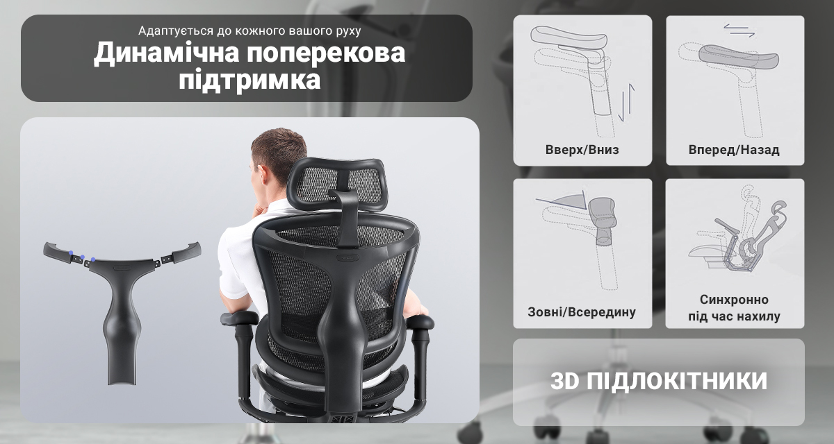 Крісло Sihoo Doro C300L A3 - поєднує сучасний дизайн, передові технології та високий рівень комфорту. Воно оснащене автоматичною підтримкою попереку, яка підлаштовується під рух користувача, забезпечуючи постійну опору спині. 4D-підлокітники регулюються у висоту, вперед/назад, в сторони та синхронізуються з нахилом спинки для максимального комфорту. Регульований підголівник дозволяє налаштовувати висоту, глибину та кут нахилу для зменшення напруги шиї. Сидіння з водоспадною формою знижує тиск на стегна, а "дихаюча" сітка забезпечує відмінну вентиляцію та зносостійкість.