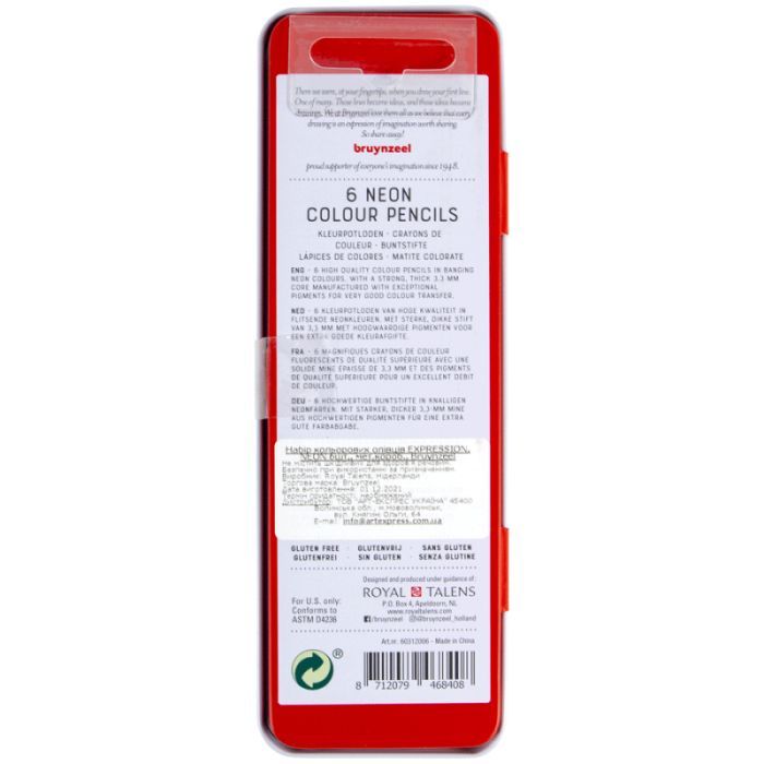 Набір кольорових олівців Expression від Bruynzeel складається із кольорових олівців, високої якості, які виділяються інтенсивними, насиченими кольорами, м’якими, густими штрихами і світлостійкістю.Підходять для роботи в різних техніках: змішування кольорів, нанесення кольорів шар за шаром, штрихування, фротаж, розтушовування в змішаних техніках.Набір у металевій коробці із вдало підібраною гаммою кольорів.Чудове рішення для студентів, початківців, аматорів та тих хто любить працювати із кольоровими олівцями.Доступні в наборах: по 6 (NEON), 12 (METALLIC, PASTEL), 24, 36 та 72 кольори. Виробник: Bruynzeel (Нідерланди)