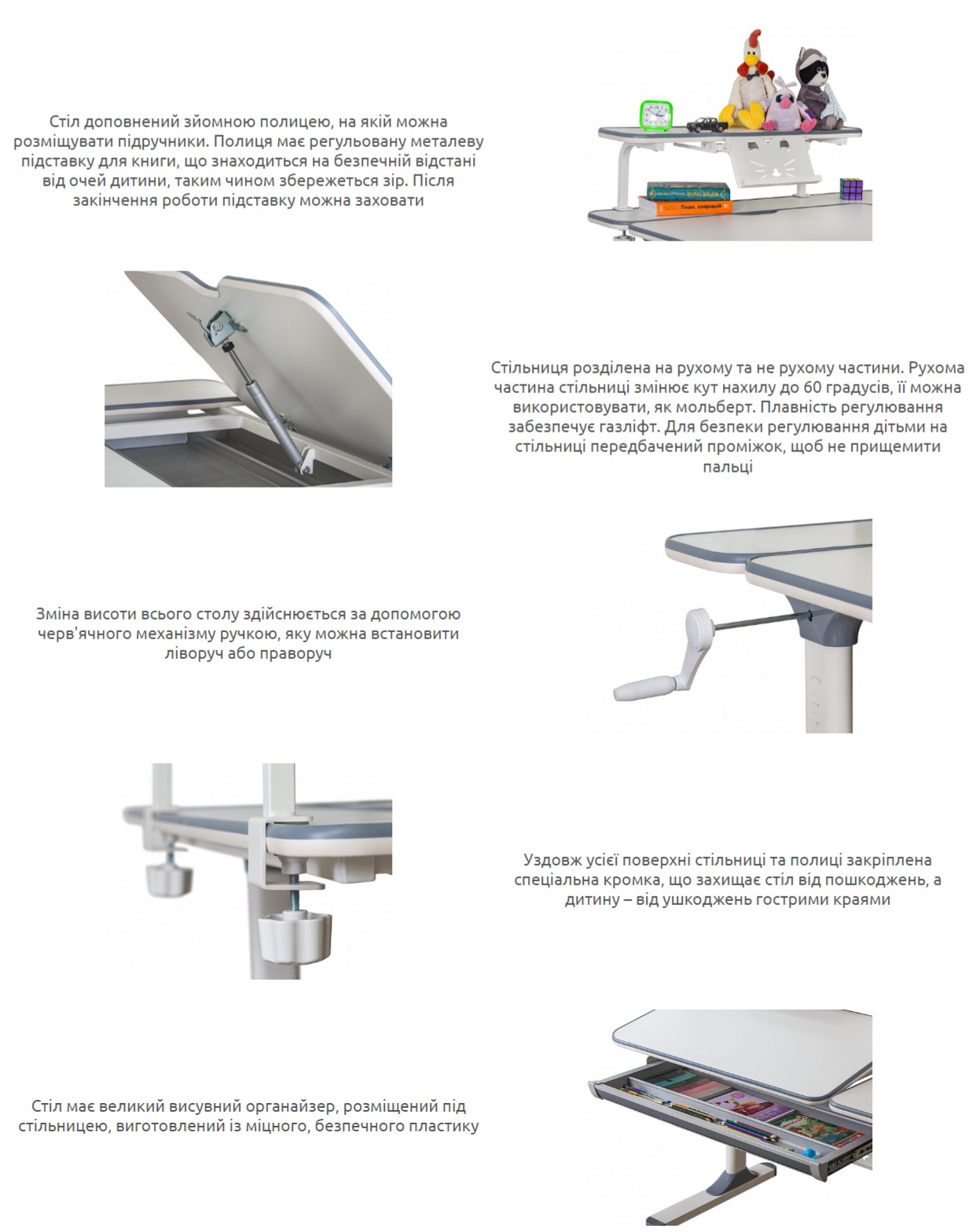 Стіл доповнений знімною полицею, на якій можна розміщувати підручники. Полиця має регульовану металеву підставку для книги. Підставка для книг знаходиться на безпечній відстані від очей дитини, у такий спосіб збережеться зір. Після закінчення роботи підставку можна засунути.