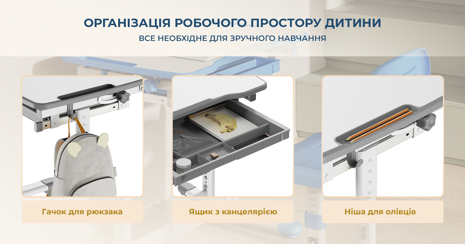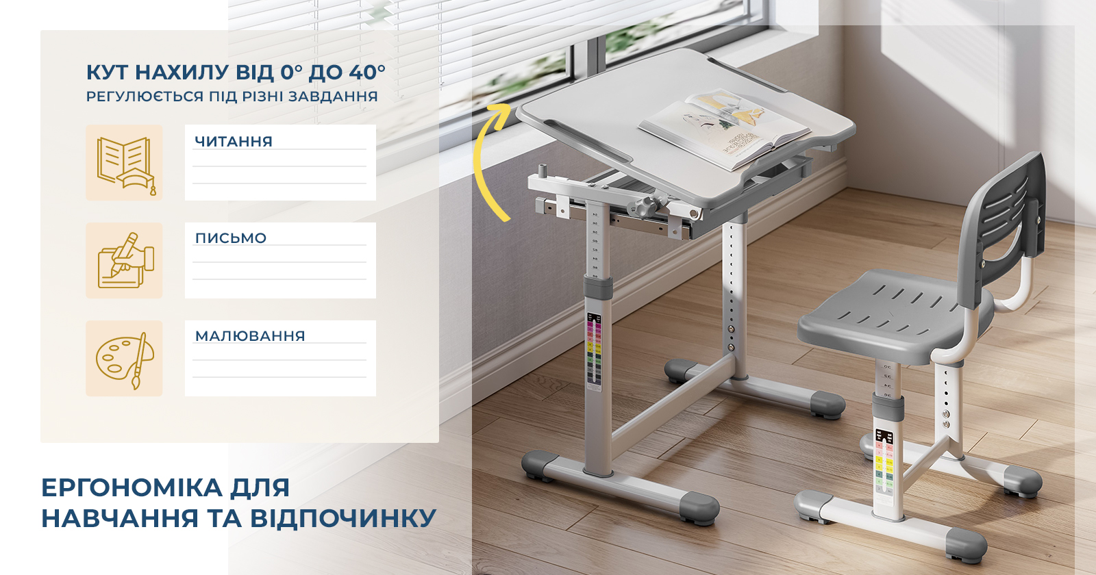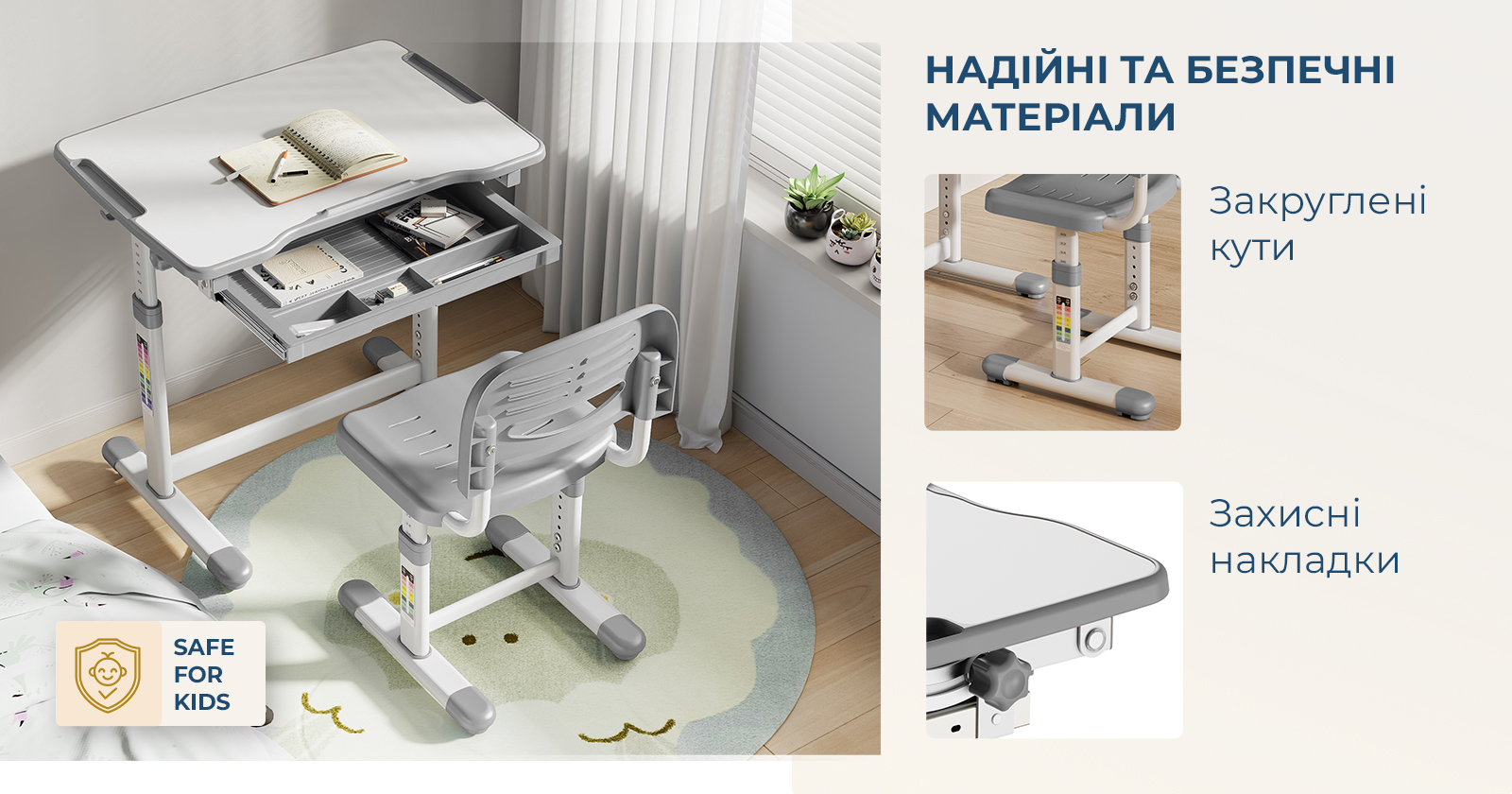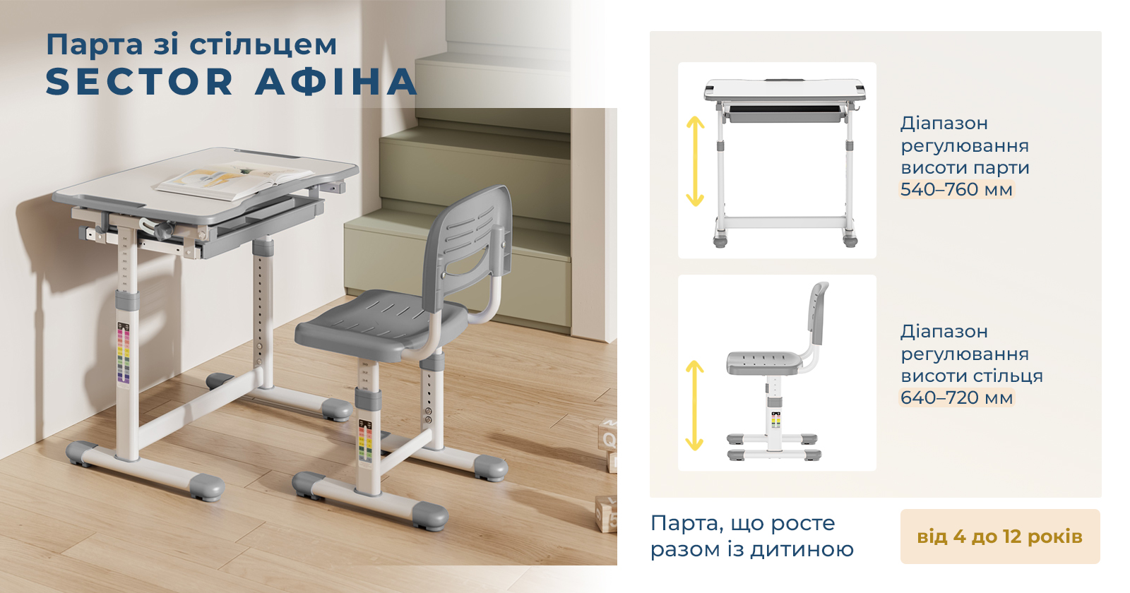 Цей комплект створений для забезпечення комфортного та безпечного навчального середовища для дітей віком від 4 до 12 років. Завдяки регульованим параметрам, парта та стілець адаптуються до зросту дитини, сприяючи правильній поставі та зменшуючи навантаження на зір.