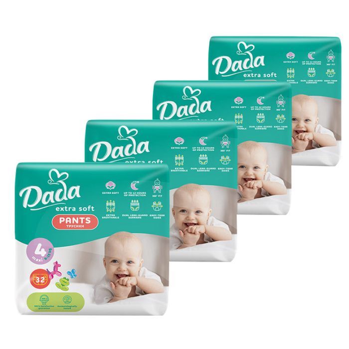 Підгузки-трусики Dada Extra Soft — це новий різновид захисту дітей. Вони відрізняються від простих підгузків — немає застібок, що дає змогу легко їх одягати та знімати, проте є такими ж надійними, як і звичайні підгузки.
