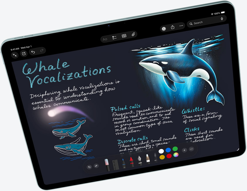 16-ядерний Neural Engine в чипі M4 робить iPad Air ще більш потужним пристроєм для штучного інтелекту. Більша єдина система пам’яті і швидший пропускний канал пам’яті пришвидшують повсякденні AI-завдання, такі як пошук тексту в Goodnotes. Neural Engine також дозволяє реалізовувати потужні AI-функції в додатках для редагування фото та відео, даючи вам більше контролю і допомагаючи втілювати ваші творчі ідеї без зусиль.