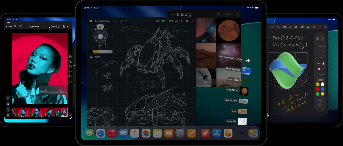 Відкривайте більше вікон одночасно, змінюйте їхній розмір та розташування на свій розсуд, розділяйте екран на третини або четвертинки. Інтенсивні завдання виконуються у фоновому режимі за допомогою Background Tasks, а за допомогою Live Activities легко керувати усім, що працює. Захоплюйте та редагуйте Smart HDR-зображення і відео до 4K ProRes, працюйте з великими 3D-сценами та складними AI-моделями, використовуючи професійні додатки.