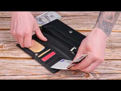 Багатофункціональний горизонтальний жіночий гаманець з натуральної зернистої шкіри в класичному чорному кольорі. Аксесуар має три великі кишені для купюр, три прилеглі кишені, вісім осередків для карток, три з них під сіточкою, монетницю на блискавці. Виріб закривається клапаном на кнопку. Відмінна ідея для подарунка, яка не залишить байдужою жодну жінку.