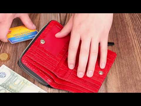 Цікавий жіночий гаманець, у комбінації з двох кольорів, чорного зовні та червоного всередині, із натуральної шкіри з тисненням під крокодила. Аксесуар має два відділення для купюр, вісім осередків для карток (одна під сіточкою), чотири прилеглі кишені та монетницю. Закривається аксесуар навпіл на кнопку. Купуючи шкіряний аксесуар цієї фірми собі або на подарунок, будьте певні, що він радуватиме око не один рік.