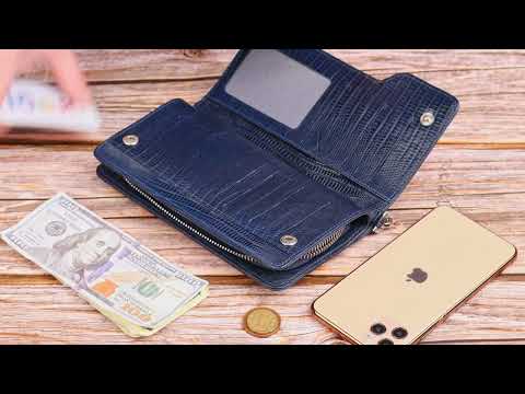 Оригінальний гаманець-клатч з натуральної фактурної шкіри з тисненням під рептилію. Аксесуар має одне основне відділення, в яке поміщаються купюри всіх номіналів, дванадцять кишень для карток, одна з яких під сіточкою, блок для карт із зовнішнього боку, дві кишеньки на блискавці, знімний кистьовий ремінь. Закривається аксесуар на блискавку, а блок для карток закривається на кнопки. Колір фурнітури – срібло. Шкіряний гаманець є дивовижним подарунком для рідних та близьких людей.