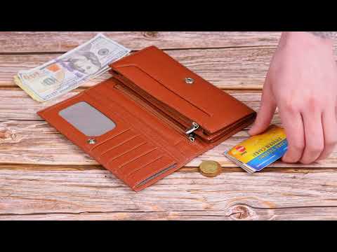 Зручний горизонтальний жіночий гаманець із натуральної зернистої шкіри, в стильному світло-коричневому кольорі. Аксесуар має три великі кишені для купюр, три прилеглі кишені, вісім осередків для карток, три з них під сіточкою, монетницю на блискавці. Виріб закривається клапаном на кнопку. Відмінна ідея для подарунка, яка не залишить байдужою жодну жінку.