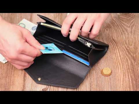 Аксесуар складається з двох широких відділень для купюр, дванадцяти осередків для пластикових карток, двох прилеглих кишень та монетниці на блискавці.