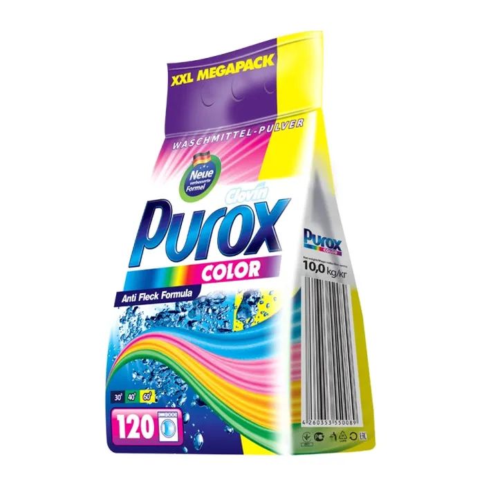 Пральний порошок Purox Color безфосфатний пральний порошок, призначений для всіх типів пральних машин, а також для ручного прання. Містить компоненти, що захищають пральну машину від утворення накипу. Пральний порошок має унікальну формулу, яка чудово справляється з різними типами плям, навіть глибокі забруднення зазнають впливу прального порошку.