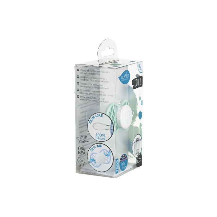 Симетрична пустушка серії Nuvita Air55 Cool. Пластина соски на 55% складається з повітря забезпечуючи майже повну аерацію області навколо рота, уникаючи скупчення слини, яка може подразнювати шкіру. Захисний ковпачок для соски для підтримки чистоти соски і стерилізації в мікрохвильовій печі простим додаванням води.