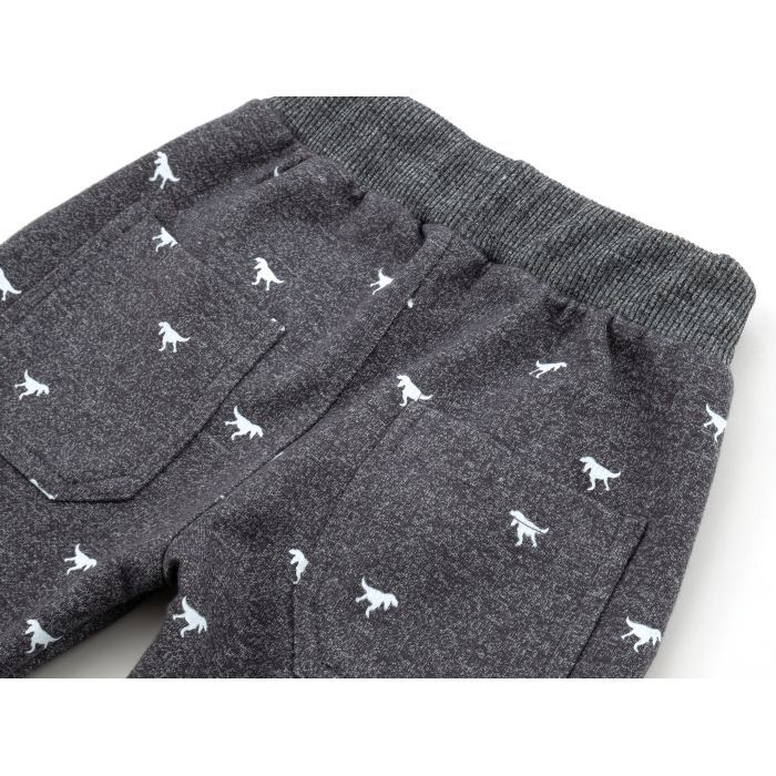 Зручні, вільні спортивні штани темно - сірого меланжевого кольору (кольору «антрацит») з дуже приємного двониткового турецького трикотажу (100% бавовна). Штанці по всій поверхні прикрашені фігурками маленьких динозавриків білого кольору.
