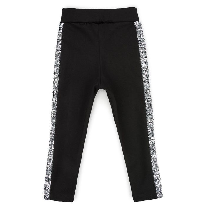 Стильна і дуже модна модель чорного кольору для Вашої модниці. Лосини трохи завужені донизу. По бічній стороні прикрашені вставками з сріблястих паєток. Зшиті з якісного, середньої щільності, двуниточного турецького трикотажу на основі натуральної бавовни з додаванням невеликого % еластану для підтримки початкової форми вироба в процесі носіння.
