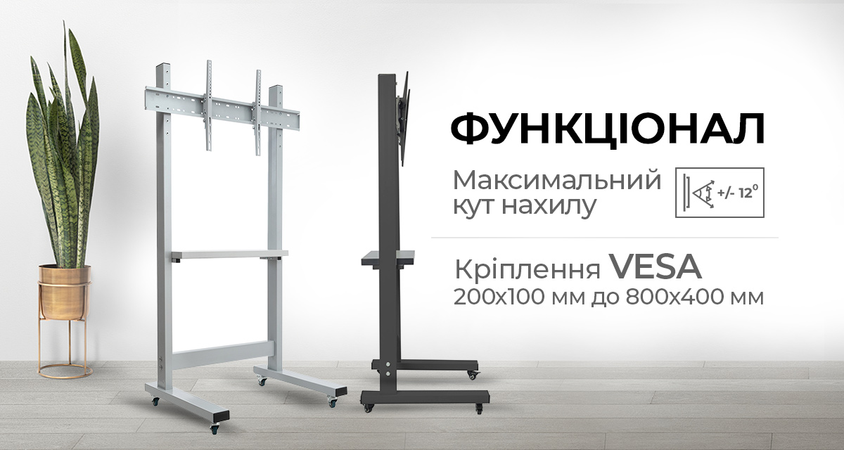 Стійка розрахована на вагу до 65 кг, що гарантує безпеку та стабільність навіть для великих екранів.Завдяки невеличким колесам, встановленим на ніжках, стійку можна легко переміщувати по приміщенню.