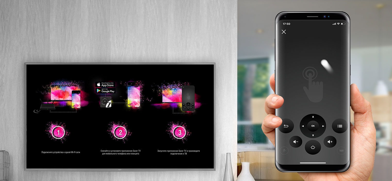 Унікальна можливість керування телевізором з мобільних пристроїв спеціально розроблена компанією Gazer. Часта проблема пошуку пульта керування тепер вирішена. Досить завантажити додаток Gazer TV на Ваше iOS або Android пристрій і підключитися до домашньої мережі Wi-Fi. Використання опцій керування, таких як: Пульт, Сенсорний ввід, Миша і Air Mouse перетворюють Ваш смартфон в Touch Pad і клавіатуру для керування Gazer TV або дають можливість керувати навіть більше, ніж аналогічний пульт дистанційного керування. Перегляд фотографій і відео з iOS і Android пристроїв також можливий прямо з додатку Gazer TV. Функції Air Play і Mirror Link дублюють екран Вашого смартфона на дисплей Gazer TV без затримок.