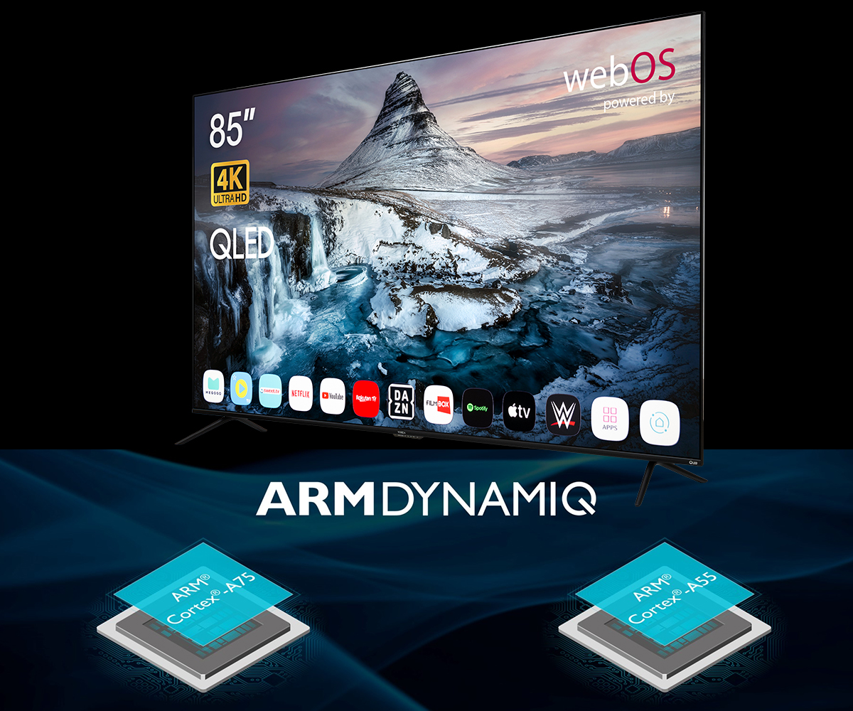 Висока швидкість обробки даних та плавна робота інтерфейсу забезпечуються сучасною архітектурою Armdynamiq. Серцем системи є комбінація процесорів ARM cortex CA75 та CA55, де кожне ядро виконує свої специфічні завдання. Ядра Cortex-A75 відповідають за вражаючу продуктивність у складних додатках та іграх, тоді як Cortex-A55 забезпечують високу енергоефективність при виконанні фонових процесів. Така гібридна архітектура гарантує миттєвий запуск програм, відсутність затримок при відтворенні відео високої чіткості та загальну стабільність роботи всієї операційної системи телевізора за будь-яких навантажень.