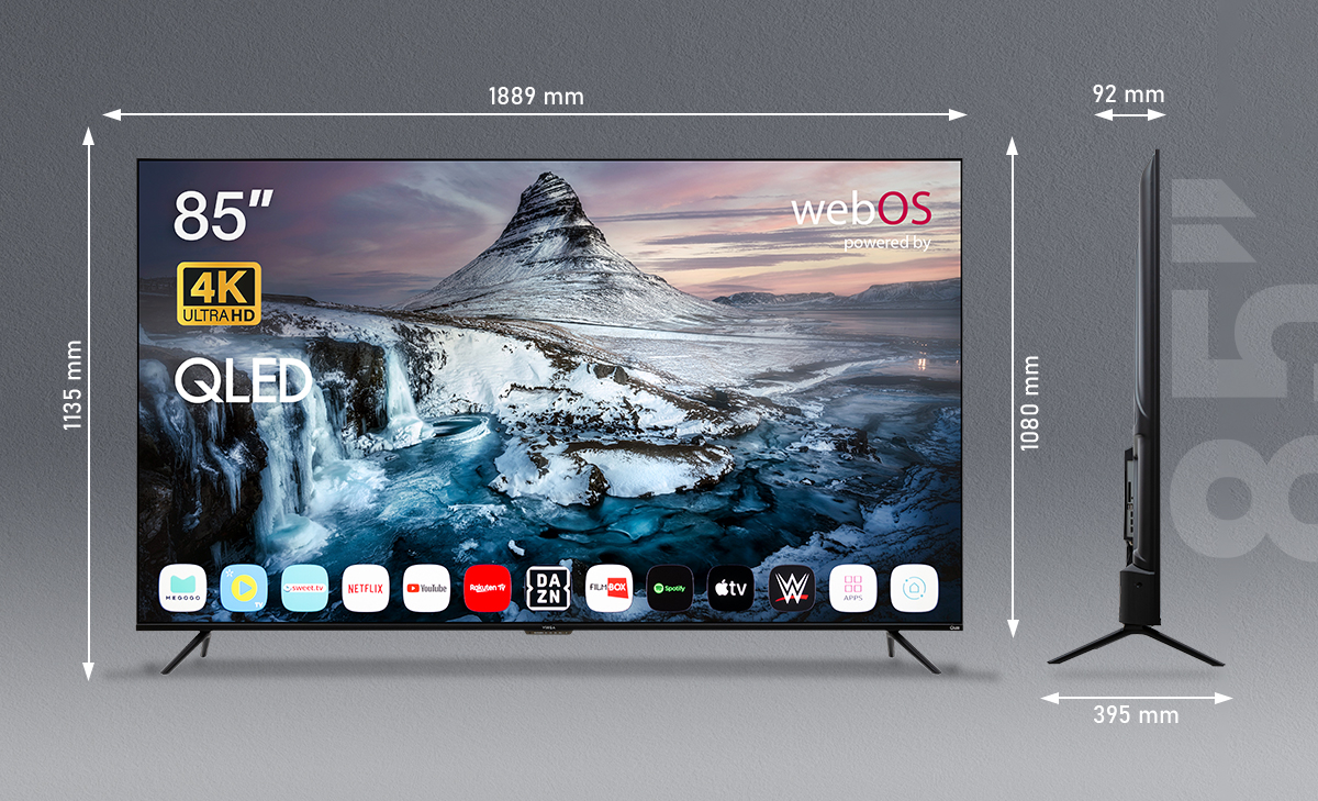 Зовнішній вигляд моделі Vinga поєднує в собі витонченість та сучасну ергономіку, що дозволяє пристрою стати окрасою будь-якого залу. Тонка рамка навколо екрану мінімізує візуальні межі, фокусуючи всю увагу глядача на подіях у фільмі. Ширина корпусу складає 1889 міліметрів, а висота разом із підставкою досягає 1135 міліметрів при глибині конструкції 395 міліметрів. Якщо ви оберете настінний варіант монтажу, то висота пристрою складе 1080 міліметрів, а його товщина буде всього 92 міліметри. Такі параметри роблять телевізор справжнім технологічним центром у вашому домі.