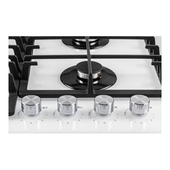 Тип поверхні - газова, газові конфорки, загартоване скло, кількість конфорок - 4, Управління - механічне, Газ-контроль - так, Електропідпал - так, Матеріал решіток - чавун, природний газ, 220 В, Розміри ніші для вбудовування - 4 х 56 х 48 см, білий