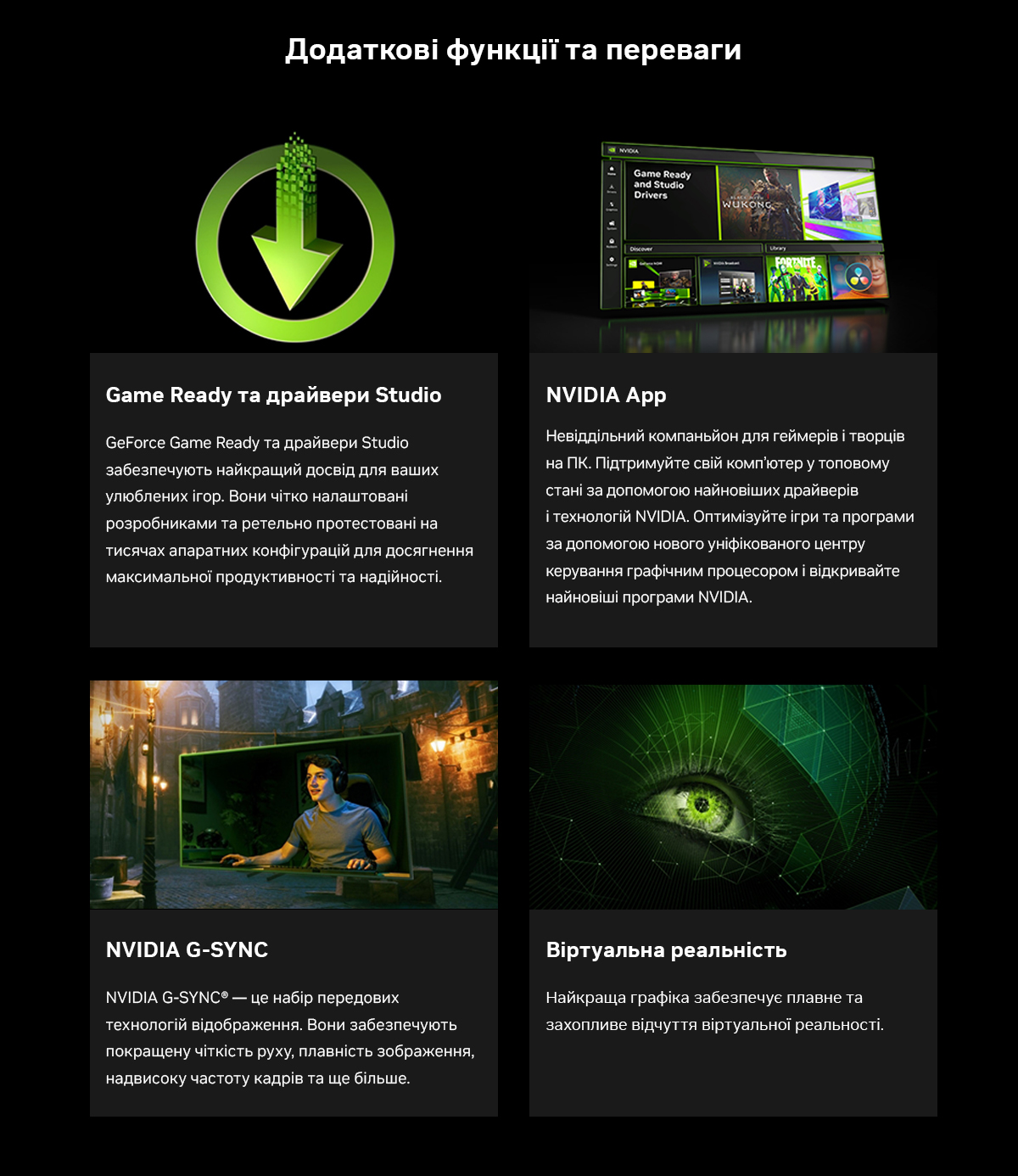 Game Ready та драйвери Studio. GeForce Game Ready та драйвери Studio забезпечують найкращий досвід для ваших улюблених ігор. Вони чітко налаштовані розробниками та ретельно протестовані на тисячах апаратних конфігурацій для досягнення максимальної продуктивності та надійності. NVIDIA App. Невіддільний компаньйон для геймерів і творців на ПК. Підтримуйте свій комп’ютер у топовому стані за допомогою найновіших драйверів і технологій NVIDIA. Оптимізуйте ігри та програми за допомогою нового уніфікованого центру керування графічним процесором і відкривайте найновіші програми NVIDIA. NVIDIA G-SYNC. NVIDIA G-SYNC® — це набір передових технологій відображення. Вони забезпечують покращену чіткість руху, плавність зображення, надвисоку частоту кадрів та ще більше. Віртуальна реальність. Найкраща графіка забезпечує плавне та захопливе відчуття віртуальної реальності.