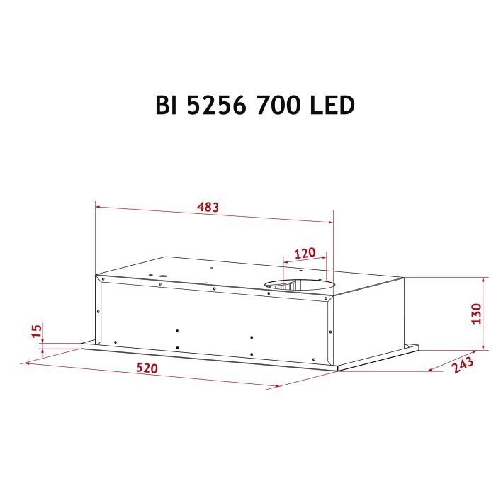 Тип - вбудована, в шафу, 700 м3/год, 70 Вт, відведення повітря і рециркуляція, ширина корпусу - 52 см, Діаметр вентиляційної труби - 120 мм, - алюмінієвий, Тип управління - кнопкове, Матеріал корпусу - скло, Лампи - LED: 1 х 2 Вт, 62 дБ, 13 х 52 х 24.3 см, 6.35 кг, чорний