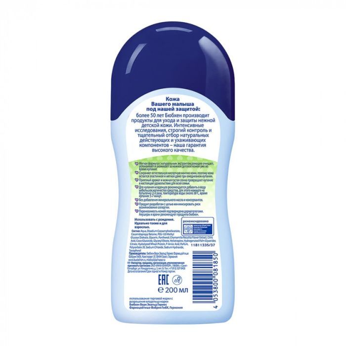 М'який зволожуючий засіб для купання делікатно очищає чутливу шкіру малюка. Спеціальна формула засобу на рослинній основі забезпечує ніжну турботу про дитячу шкіру, зволожуючи і живлячи її. Містить різні зволожуючі компоненти для оптимального догляду за ніжною дитячою шкірою, а також комплекс «Бюбхен – Активний захист шкіри», що перешкоджає надмірній втраті вологи через шкіру. Зволожує шкіру, завдяки натуральним активним компонентам: ромашки, протеїнів пшениці, пантенолу і геліотропіну. Підходить для щоденного застосування. Не містить синтетичних барвників та ароматизаторів.
